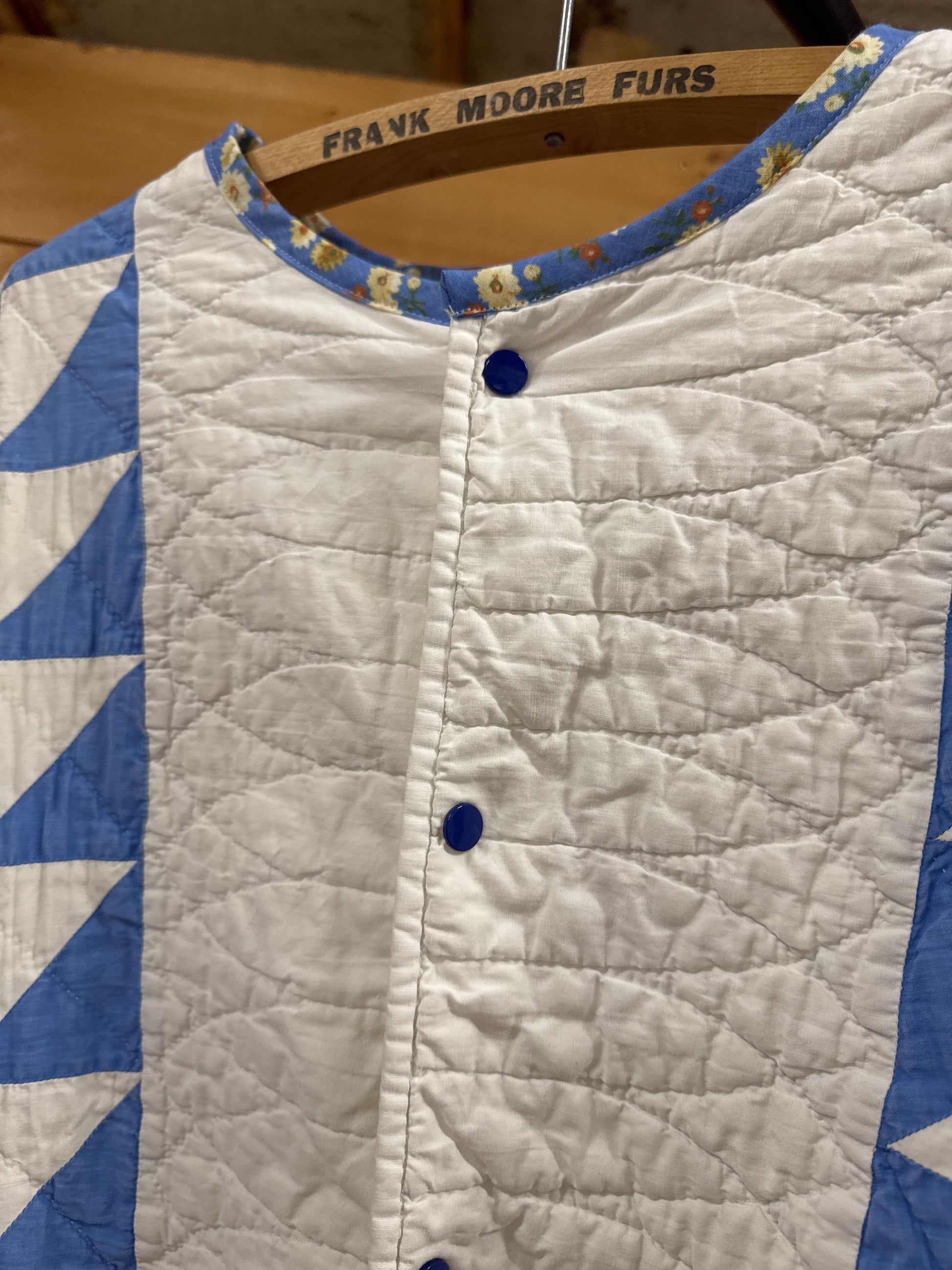 The Blue Bird Quilt Coat is a stunning piece crafted from a vintage pinwheel motif quilt, bringing sustainable style and timeless warmth to your wardrobe. This isn't just a coat—it's wearable art with serious personality.