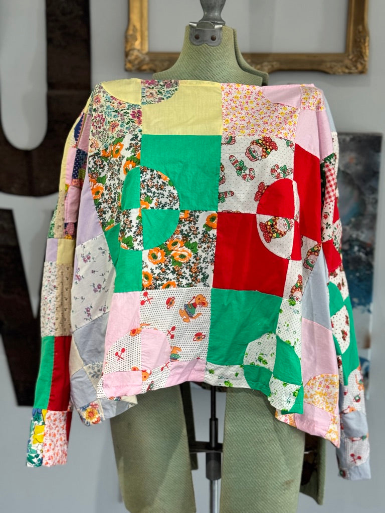 Every square is a reminder that mismatched equals magic and circles don't need to be perfect to turn heads. This piece celebrates the beauty of vintage craftsmanship and the joy of color that doesn't follow the rules.