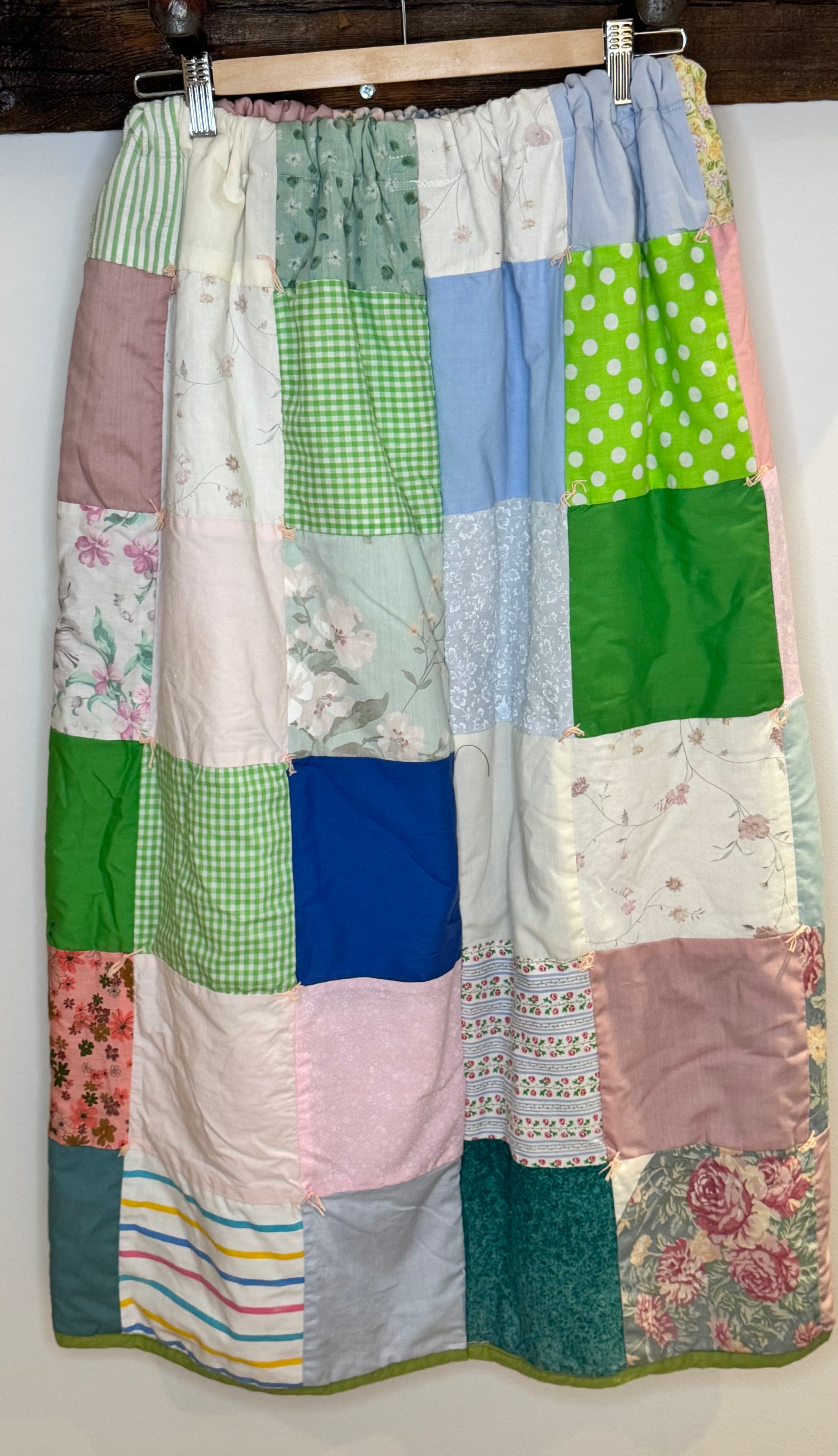 This one-of-a-kind quilt skirt is stitched from a joyful mix of vintage patterns—florals, ginghams, plaids, and prints that feel like flipping through your grandmother's fabric scrapbook. Finished with a relaxed elastic waist and an effortlessly timeless silhouette, it's the skirt that makes getting dressed feel like an adventure.