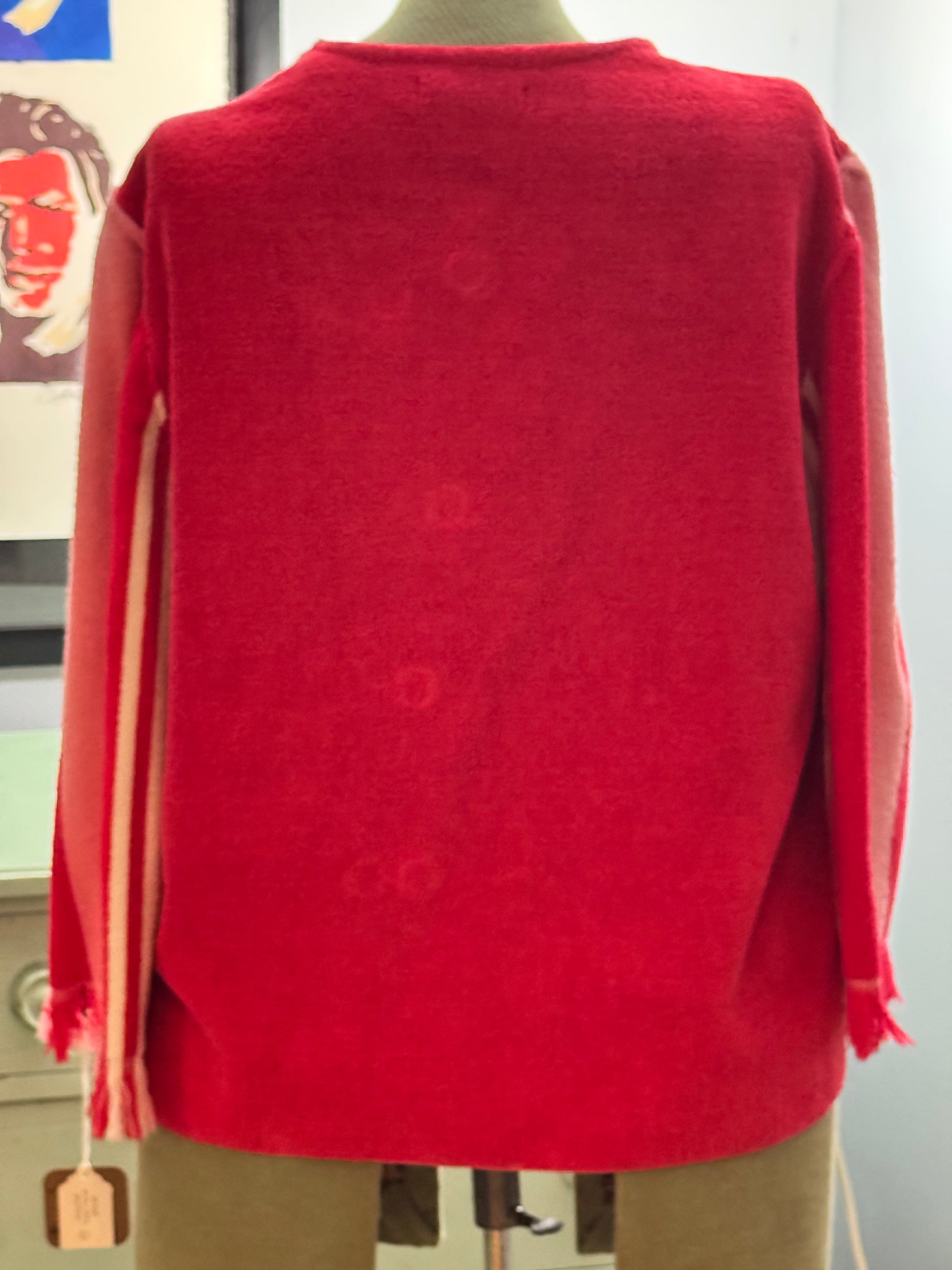 The Ruby Red Towel Jacket proves otherwise! This vibrant red and pink button-up is upcycled from vintage terry cloth, creating a piece that's equal parts cozy, playful, and practical.